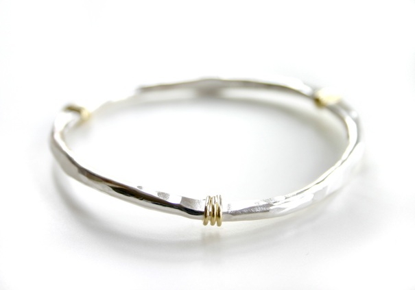 Heavily worked to give three flat hammered sides both vertically and horizontally. Three hammered sections are bound with 18 carat gold wire.