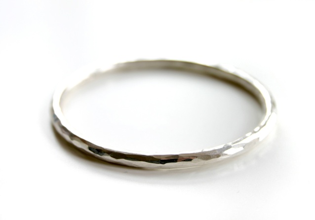 This simple bangle catches the light with its hammered surface and can be mixed and matched with a collection of other wrist jewellery.