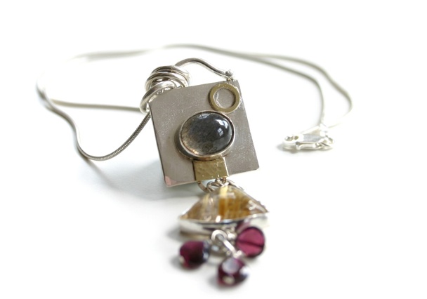 Silver, labradorite stone, rutilated quartz stone, garnet beads, 18 carat gold
